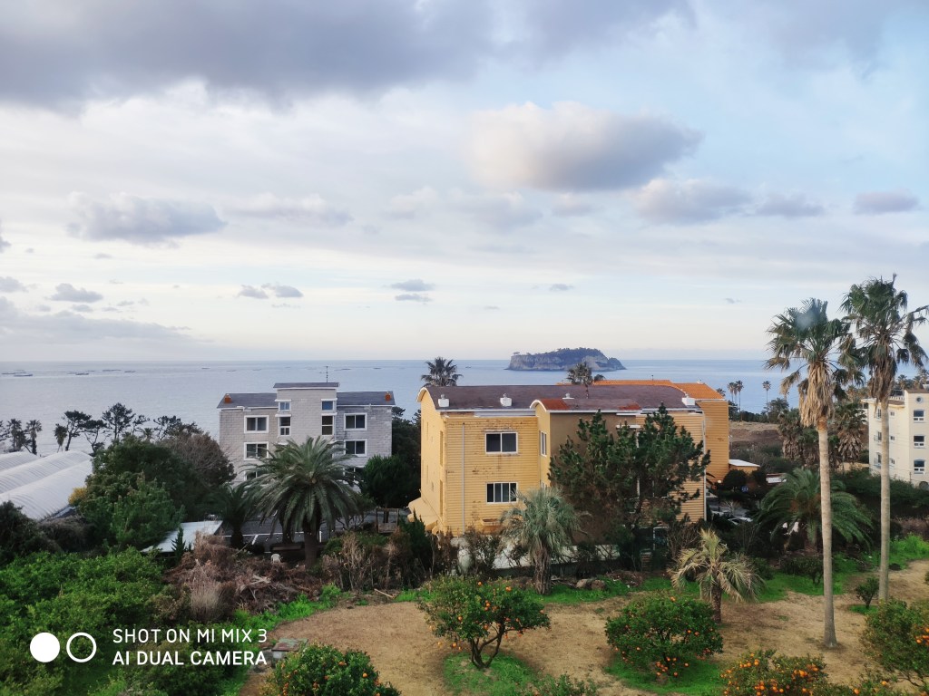 A window had been left open, so we were frozen to the bone — we were not expecting the island to be this cold! Even the main volcano (Mt. Hallasan – tallest mountain in S. Korea!) is snow capped right now! Temperatures have been somewhere between the 40s to 50s F, justifying lugging our jackets around. We have actually been blessed, since we packed clothes expecting a 2 week winter vacation and don’t really have summery clothes on hand. π€π